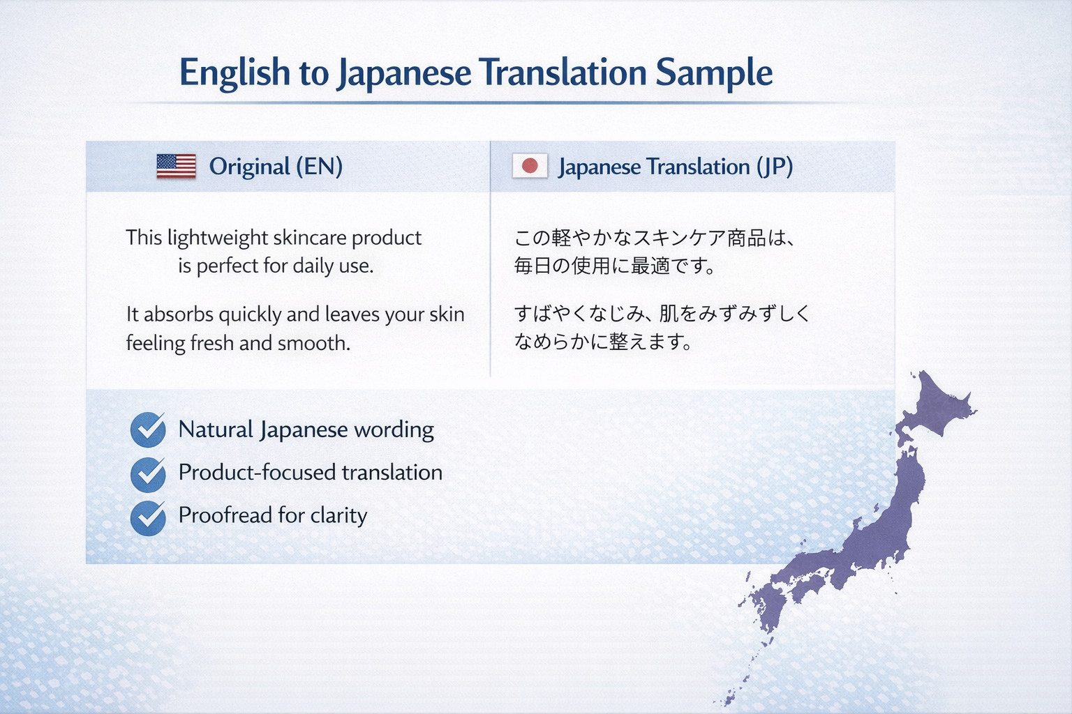 I provide simple and natural English to Japanese translation. I can translate short texts, product descriptions, messages, blog content, and social media posts. I focus on clear, easy-to-read Japanese. I am careful, responsive, and always do my best to deliver clean and accurate work.