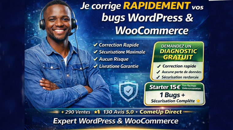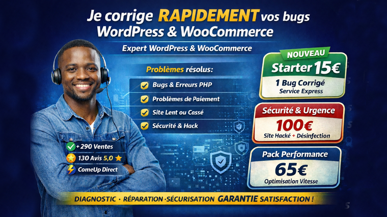 ✅ ➕ 300 clients satisfaits, 100 % respect des délais. Je crée des sites performants, sécurisés et optimisés SEO. Réparation de bugs, installation de modules, maintenance et traduction. Disponible immédiatement via ComeUp Direct. Transformez vos idées en site professionnel dès aujourd’hui ! Mes Statistiques 📊 sur Come Up : 🎯 Projets finalisés : ➕ de 300 ❤ Taux de satisfaction : 99% ✨ Score : 5 étoiles sur tous les services 🤝 Assistance : 100% ( ce qui me vaut le surnom, l'Expert en la matière 😃 ) Développeur web spécialisé en WordPress & WooCommerce, j’accompagne particuliers, entrepreneurs et entreprises dans la création, traduction, l’optimisation et la sécurisation de leurs projets digitaux. Mon approche est orientée performance, fiabilité et résultats mesurables : sites rapides, stables, bien référencés et pensés pour convertir vos visiteurs en clients. Avec plusieurs années d’expérience et plus de 230 avis positifs, je m’engage à fournir un travail rigoureux, professionnel et conforme à vos objectifs business. Ce que je peux faire pour vous Création de sites web modernes et sur mesure (vitrine & e‑commerce) Développement WordPress & WooCommerce Traduction site web Correction de bugs critiques ou bloquants Installation, configuration et personnalisation de plugins Optimisation SEO (technique et structurelle) Amélioration de la vitesse de chargement (Core Web Vitals) Maintenance, sécurité et mises à jour Design web orienté expérience utilisateur (UX) Chaque intervention est réalisée avec une logique de qualité, durabilité et évolutivité. Méthodologie de travail Analyse et compréhension précise de votre besoin Proposition de solution claire et adaptée Conception et maquettage si nécessaire Développement et intégration Configuration, sécurisation et tests Livraison, validation et accompagnement Vous bénéficiez d’un suivi sérieux, d’une communication claire et de délais respectés. Agissez maintenant ! Contactez-moi dès aujourd’hui pour transformer vos idées en site web professionnel et performant. Les créneaux sont limités pour garantir la qualité de chaque projet.