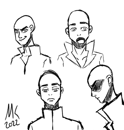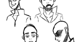 Un personnage entier debout fini avec encore les trais du sketch avec une pose + un croquis de 2 visage et un buste mise en couleur rapidement