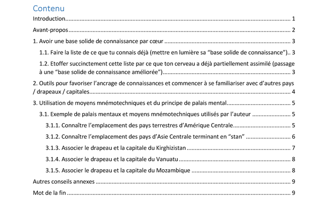 N'ayant trouvé aucun tutoriel du genre, j'ai décidé de créer mon propre tutoriel PDF de 9 pages - dont le sommaire est visible dans la galerie image - et de le partager ici. Cette méthode tire profit de certains concepts permettant d'améliorer sa mémoire et de retenir facilement divers éléments, que j'ai spécifiquement adapté pour connaître les pays et leurs drapeaux (ainsi que leur capitales et emplacement géographiques).