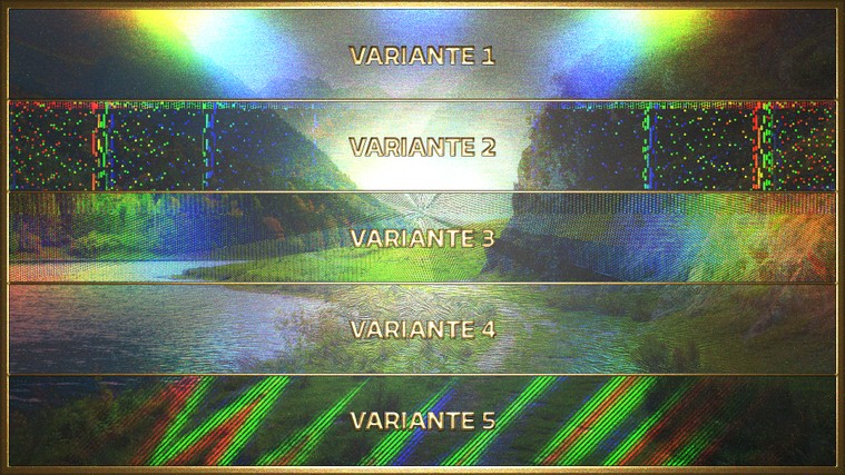 Les dix variantes différentes couvrent des effets de textures, effet 3D, à plat, holographique ou métallique, avec plusieurs teintes de couleurs possibles.
