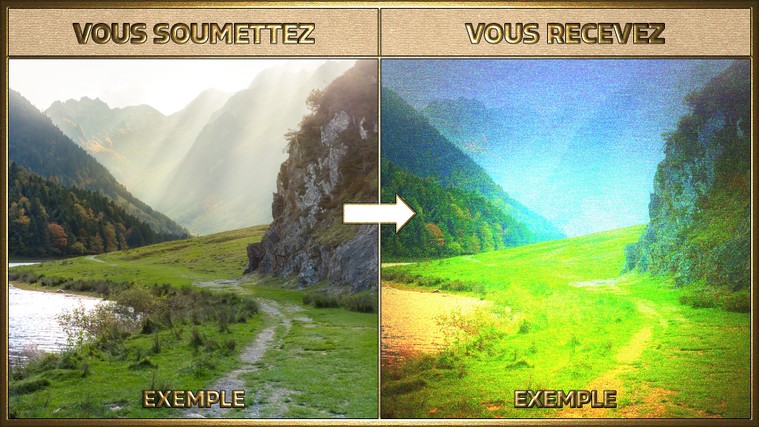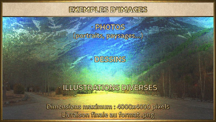 Tout ce que vous aurez à fournir après commande, c'est l'image elle-même sur laquelle vous voulez que cet effet soit appliqué, et la variante que vous désirez.