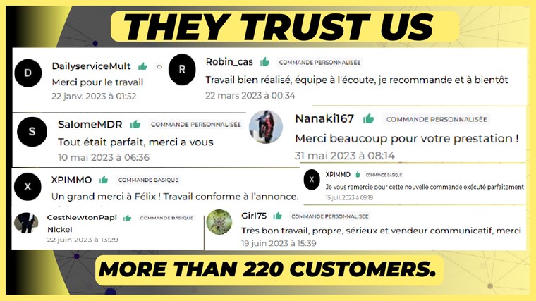 Bonjour, nous sommes DEV-AUDIENCE, des experts en développement d'audience et en référencement naturel avec plus de 4 ans d'expérience. Grâce à notre expertise, nous avons aidé de nombreuses entreprises et professionnels à améliorer leur visibilité en ligne et à attirer un trafic qualifié. ✅ Notre engagement : Vous offrir des solutions sur mesure et vous fournir un travail de qualité irréprochable pour surpasser vos attentes. 💼 Plus de 200 clients ont déjà fait appel à nos services, et nous serions ravis de vous compter parmi nos futurs clients. ✨ Disponibles 24/7, nous sommes toujours prêts à répondre à vos questions et à vous accompagner dans la réussite de vos projets. N'hésitez pas à essayer nos services, et ensemble, faisons de votre présence en ligne un véritable atout.
