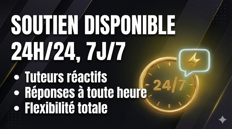 Nos tuteurs sont disponibles 24 heures sur 24, 7 jours sur 7, pour répondre à vos questions et vous fournir une assistance, vous offrant ainsi la flexibilité nécessaire pour obtenir de l'aide quand vous en avez besoin, même en dehors des heures normales de travail.