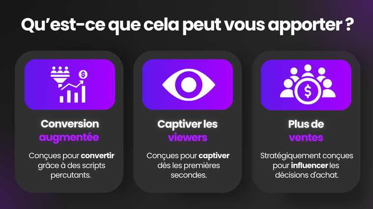 Mon approche experte combine un script stratégique et un montage professionnel pour captiver dès les premières secondes. Chaque élément est soigneusement conçu pour convertir vos visiteurs en clients engagés, prêts à franchir le pas.