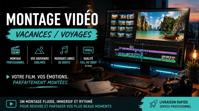 Je réalise des montages vidéo propres, immersifs et rythmés à partir de vos images, pour vous permettre de revivre vos meilleurs moments et les partager facilement.