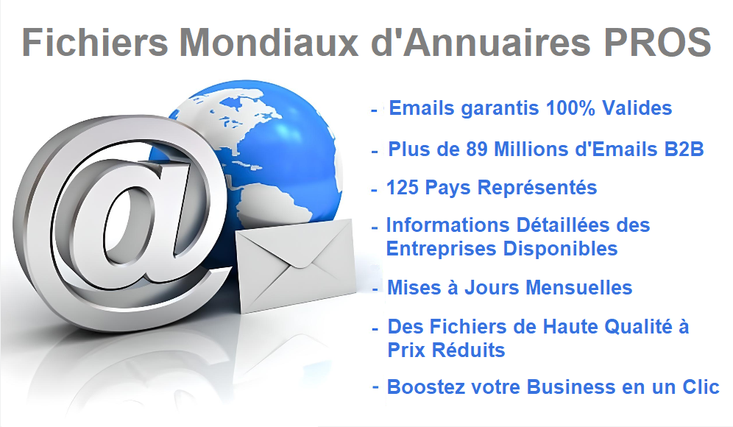 Remarques : Les informations complémentaires autres que celles contenues dans la ou les colonnes "Emails" auront un taux de remplissage variable en fonction du pays sélectionné. Seule la colonne "Emails" sera remplie à 100% et tous les emails auront été vérifiés au préalable.