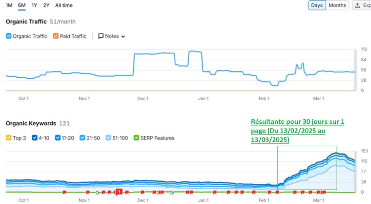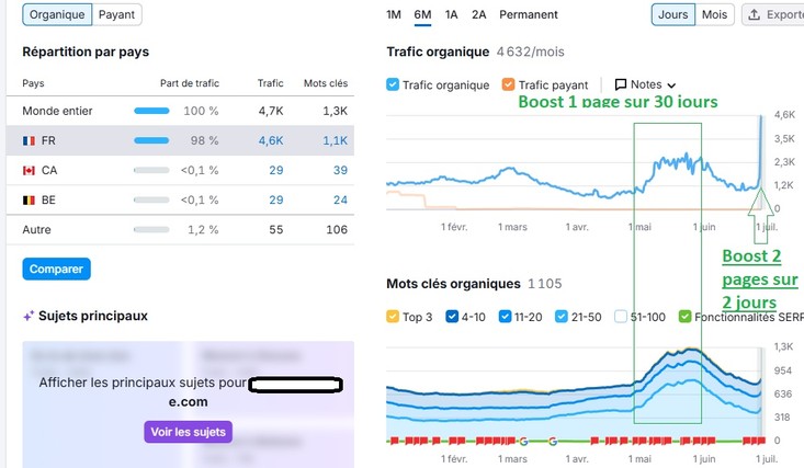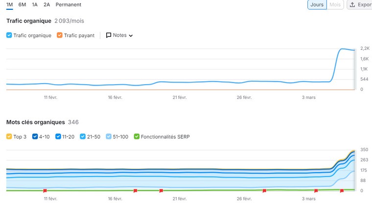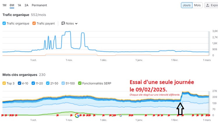 - Après ce délai, il y a une baisse naturelle du trafic, mais certaines requêtes peuvent se stabiliser durablement à un niveau plus élevé qu’avant si le site est pertinent.