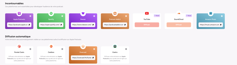 Les plateformes de difussion sont : Apple Podcasts, Spotify, Deezer ,Podcast Addict, YouTube (en option sur ausha avec l'offre boost), SoundCloud (en option sur ausha avec l'offre boost), Amazon Music,