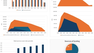 - A forecast tailored to your project (costs, revenue, investments, funding needs, balance sheet, income statement, cash flow, IRR, NPV)