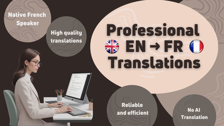 Need precise, natural-sounding translations from English to French? I help you get your message across, clearly, fluently, and with style. Whether you're working on subtitles, product listings, training materials or travel guides, I make sure the French version reads like it was written for a native audience, no awkward phrasing, no guesswork. I'm a French native with strong general knowledge and a background in psychology, tech and media. I’ve translated content for researchers, online shops, coaches, hotels, and more. ✅ Reliable, fast and easy to work with ✅ No machine translation ✅ Tone and audience fully adapted to your needs 📚 Here’s a glimpse of the types of content I work on, and I’m always open to more: Education / Research: diplomas, transcripts, recommendation letters, scientific articles, abstracts, student policies e-Commerce: Etsy/Amazon/eBay listings, FAQs, return policies, customer messages Tourism: brochures, websites, hotel guides, welcome messages, registration forms Coaching / Wellness: ebooks, newsletters, training modules, toolkits, questionnaires Media / Subtitles: subtitles (SRT/VTT/embedded), blog posts, video scripts, social media content I don’t handle legal, medical or highly technical texts, unless they’re written in a simple or popularized way. Got something else in mind? Feel free to ask, I’d love to hear more about your project. I’m ready to help. Shall we get started? Besoin de traductions fluides et naturelles, de l’anglais vers le français ? Je vous aide à faire passer votre message avec clarté, précision et un style adapté. Que ce soit pour des sous-titres, des fiches produit, des supports de formation ou des guides touristiques, je traduis vos contenus pour qu’ils aient l’air écrits directement en français, sans tournures maladroites, sans approximation. Je suis française de naissance, avec une solide culture générale et une expérience en psychologie, tech et médias. J’ai travaillé avec des chercheurs, des e-commerçants, des coachs, des hôtels, etc. ✅ Rapide, fiable et facile à contacter ✅ Zéro traduction automatique ✅ Ton et public cible respectés et adaptés 📚 Voici un aperçu des types de contenus sur lesquels je travaille : Éducation / Recherche : diplômes, relevés de notes, lettres de reco, articles scientifiques, résumés, règlements étudiants e-Commerce : fiches produit (Etsy, Amazon, etc.), FAQ, politiques de retour, messages client Tourisme : brochures, sites web, menus, formulaires d’inscription, messages d’accueil Coaching / Bien-être : ebooks, modules de formation, newsletters, outils, questionnaires Médias / Sous-titres : sous-titres (SRT/VTT ou intégrés), scripts vidéo, articles, posts réseaux sociaux Je ne prends pas en charge les contenus juridiques, médicaux ou trop techniques, sauf s’ils sont formulés de manière simple ou vulgarisés. Vous avez un autre type de contenu en tête ? N’hésitez pas à me demander : je serai ravie d’en discuter. Je suis prête à vous aider ! On commence ?