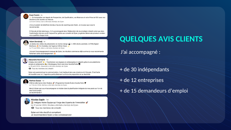 ⭐ + de 50 clients accompagnés sur LinkedIn en 2025 🔥 Optimisation de profils 🚀 Création de contenus & Acquisition de leads Depuis plusieurs années j’aide dirigeants, indépendants et professionnels à transformer LinkedIn en un véritable générateur d’opportunités. Optimisation de profils, contenus engageants, gestion des interactions et visibilité algorithmique : une approche 360° pour attirer des prospects qualifiés, développer son influence ou décrocher le job visé. 💥 POURQUOI MOI ? ✅ Consultant certifié officiellement par LinkedIn 🏆 76e France dans la stratégie marketing 🇫🇷 ⭐ + de 50 clients accompagnés en 2025 📈 Expertise complète : profil, contenus, leads, interactions & recherche d’emploi 📞 Réactif et disponible 7j/7 👉 Cliquez sur “Me contacter” pour échanger sur vos objectifs et mettre en place la stratégie qui fera de LinkedIn votre meilleur levier d’acquisition et d’opportunités.