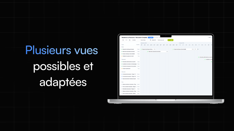 • Vue Kanban, Calendrier ou Gantt (au choix)