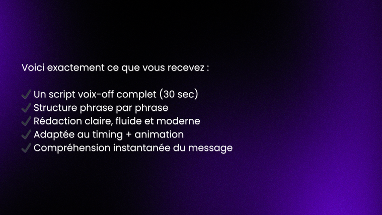 Je vous rédige un script voix-off professionnel, pensé pour être parfaitement animé, compréhensible en quelques secondes, et orienté conversion.