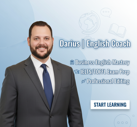 I’m Darius, an English coach specializing in Business English, IELTS/TOEFL preparation, and professional academic or business communication. I work with learners who need fast, noticeable improvement whether for a job opportunity, an exam score, or an important presentation. My approach is direct, strategic, and fully personalized to your goals.