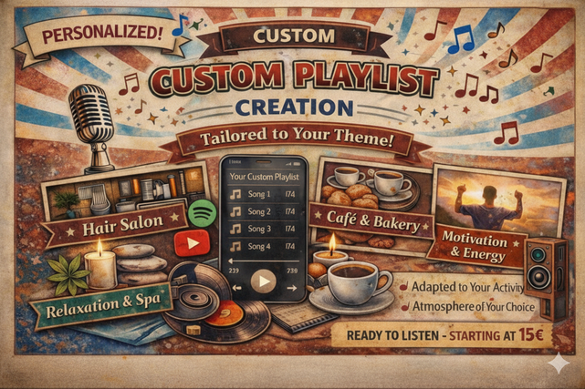 I deliver playlists that are ready to listen and perfectly adapted to your space or occasion. Everything is designed to save you time and make your moments unforgettable.