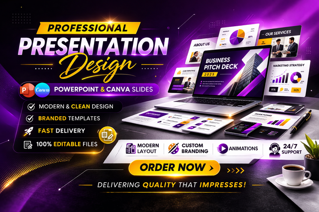 Are you looking for a presentation that doesn’t just look good but communicates clearly and converts? I design clean, modern, and impactful presentations using PowerPoint and Canva that help businesses, entrepreneurs, and professionals deliver their message with confidence. Whether you need: • Business presentations • Pitch decks • Sales presentations • Webinar slides • Training materials • Investor decks I focus on strong visual hierarchy, brand consistency, and clear storytelling, so your slides are not crowded, boring, or confusing. What you can expect when working with me: ✔ Professional and modern design ✔ Clean layouts and strong typography ✔ Brand-aligned visuals ✔ Fast communication ✔ On-time delivery My goal is simple: to make your message clear, persuasive, and visually powerful. Let’s turn your ideas into slides that stand out.