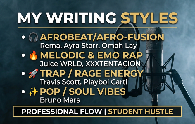 About Lex Charming Are you looking for a unique flow, catchy melodies, and high-quality bars for your next project? My name is Lex Charming, and I am a professional songwriter and recording artist specializing in Afrobeat, Trap, and Melodic Rap. With a focus on modern sounds and infectious energy, I help artists and producers bring their tracks to life with professional-grade vocals and world-class lyricism. Whether you need a high-energy club anthem or a smooth, soulful vibe, I deliver lyrics that resonate and flows that stay stuck in your head. What I Offer: Authentic Verses: Custom rap verses tailored to your beat's mood. Catchy Hooks: Memorable melodies designed for radio and streaming. Songwriting: Full-song lyric composition from scratch. Why Work With Me? Professional Standards: Clean recordings using industry-standard equipment. Fast Communication: I work closely with my clients to ensure the final product exceeds expectations. Cultural Edge: I bring an authentic Nigerian Afrobeat influence combined with a global Trap sound. Let’s make a hit together. Send me a message to discuss your project!