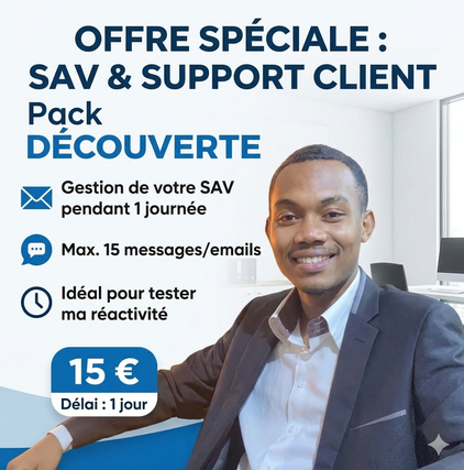 Offre de base : gestion de votre SAV pendant 1 journée (max. 15 messages/e-mails). Idéal pour tester ma réactivité ($17.63)