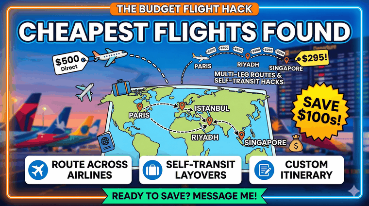 You provide your departure city, destination, and travel dates. I research various airline combinations, budget carriers, and layover hubs to build a custom itinerary. I then send you the specific flight numbers and booking links.