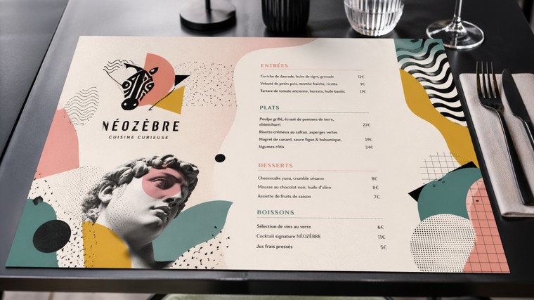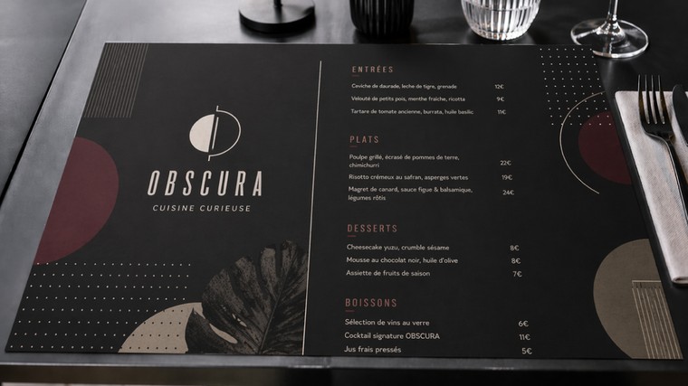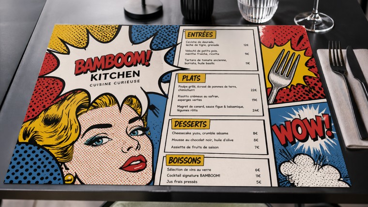 Je crée pour vous un set de table A3 sur mesure au rendu professionnel, moderne et parfaitement adapté à votre établissement. Un outil marketing discret mais puissant qui travaille pour vous à chaque service.