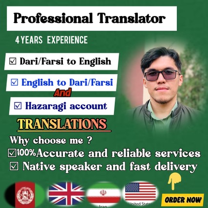 Hello! I am a native Dari/Persian speaker and a professional translator with extensive experience translating Dari (Farsi), Pashto, English languages and Hazaragi accent. I hold a BA in English Language and Literature and have worked with several public and private organizations in Afghanistan. Most recently, I served as the (Head of M&E) at a high-ranking ministry, where I prepared and translated numerous high-level reports for international stakeholders. My translations are accurate, professional, and context-sensitive ,ensuring clarity and cultural relevance. I offer: _Fast delivery _100% human translation _High accuracy & confidentiality _Affordable rates Whether you need document translation, website content, official reports, or general texts, Im here to provide top-quality results. I am honest in my work and strive for full client satisfaction. Lets work together!