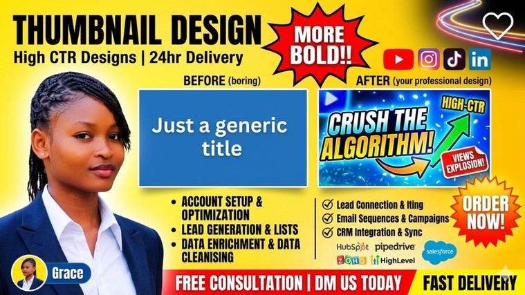 Professional YouTube Thumbnail Designer specializing in high-converting, click-worthy thumbnails that boost views and grow channels. I create custom thumbnails that stop the scroll and drive clicks. From bold text designs to eye-catching visuals, every thumbnail is optimized for maximum CTR (Click-Through Rate) and audience retention. Why Work With Me? • 24-hour delivery – Fast turnaround for trending content • CTR-focused design – Proven to increase views • Unlimited revisions – Until you're 100% satisfied • 24/7 support – Quick response, always available My Services: YouTube Thumbnails , Gaming Thumbnails, Vlog Thumbnails, Tutorial Thumbnails, Reaction Thumbnails, Business Channel Thumbnails, Face Thumbnails, Text-Based Thumbnails, Custom YouTube Graphics , Thumbnail Templates, Channel Art, Video Titles Optimization, YouTube SEO, Content Creator Graphics, Viral Thumbnail Design, Clickbait-Free High CTR Thumbnails , Thumbnail A/B Testing | YouTube Branding, Social Media Graphics, Instagram Reels Covers, TikTok Video Covers, Podcast Thumbnails, Live Stream Thumbnails, YouTube Shorts Thumbnails, 4K Thumbnail Design | Mobile-Optimized Thumbnails Tools I Use: Adobe Photoshop | Canva Pro | Adobe Illustrator | Figma | Photopea | GIMP | After Effects | Premiere Pro Results You Can Expect: Higher click-through rates | More views per video | Better audience engagement | Professional channel branding | Consistent visual identity Message me before ordering for custom quotes! Let's make your next video impossible to ignore.