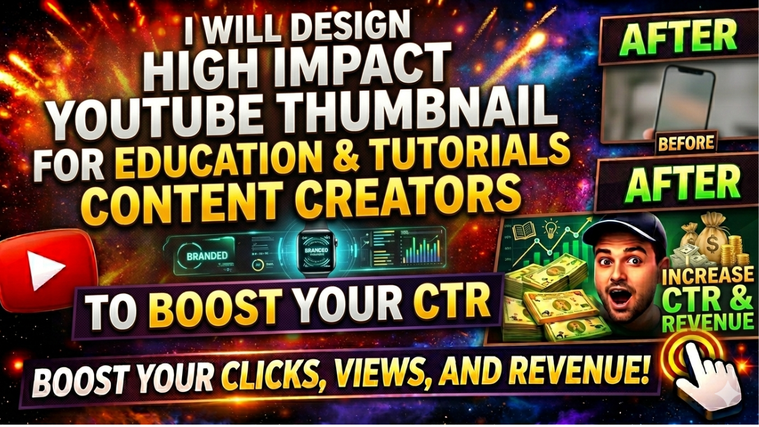 I design high-impact YouTube thumbnails for Education & Tutorials creators. From online courses, how-to videos, coding, academics, to skill-based training, I create clear, engaging visuals tailored to your audience.