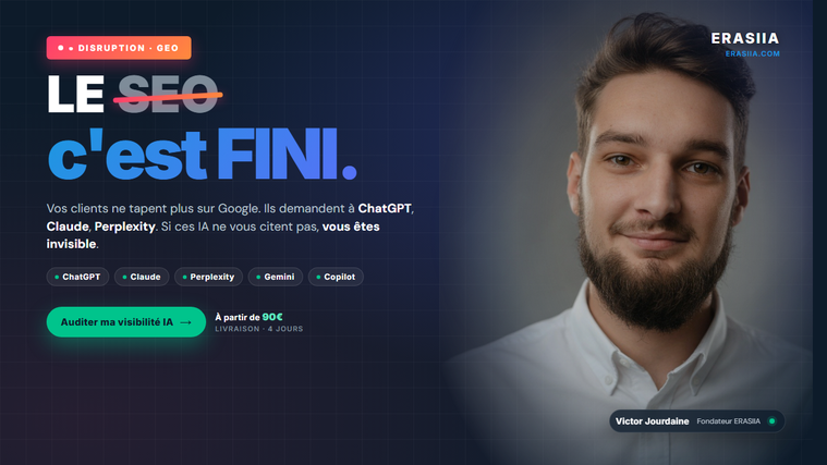 Bienvenue chez ERASIIA, votre partenaire digital spécialisé en GEO | SEO, automatisation IA et création web. Je vous aide à développer votre visibilité en ligne et à gagner du temps grâce à l'intelligence artificielle. Mes services : Audit SEO | GEO complet et plan d'action personnalisé Rédaction d'articles SEO | GEO optimisés pour Google Automatisation de tâches avec l'IA (emails, CRM, reporting) Création de sites vitrines et landing pages performantes Stratégie de contenu et plan éditorial sur mesure Pourquoi me choisir ? Approche data-driven : KPIs mesurables et reporting transparent Approche data-driven et orientée ROI Communication transparente et réactivité Audit initial gratuit de 30 minutes Chaque projet commence par une analyse approfondie de vos besoins. Contactez-moi pour en discuter !