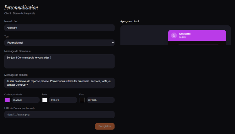 - Widget web personnalisable (couleurs, nom du bot, message d'accueil, avatar)