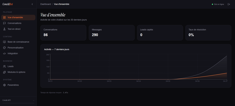 - Dashboard admin basique : conversations, FAQ éditable, statistiques simples