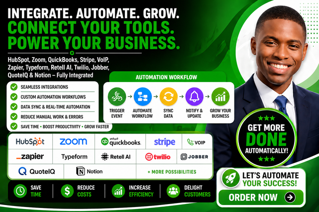 I will integrate and automate your entire workflow across HubSpot, Zoom, QuickBooks, Stripe, VoIP systems, Zapier, Typeform, Retell AI, Twilio, Jobber, QuoteIQ, and Notion—so everything works seamlessly together.