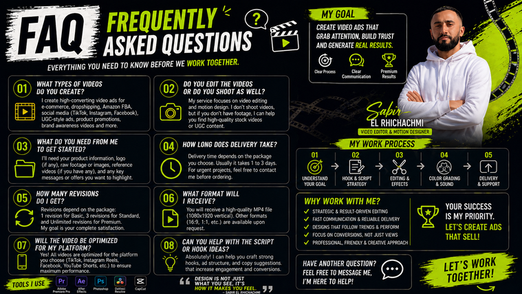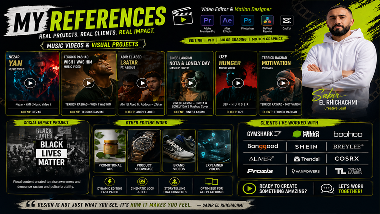 Here’s a refined, high-conversion English version—more premium, sharper positioning, and focused on results (not just description): 🚀 Sabir El Rhichachmi Graphic Designer • 3D Designer • Visual Communication Specialist I don’t just create visuals — I design assets that perform, convert, and work in the real world. With over 7 years of experience, I help brands and entrepreneurs turn ideas into high-impact visual solutions ready for web, print, and industrial production. 🎯 What I Actually Do Most designers focus on making things “look good.” I focus on making visuals that: Capture attention instantly Build trust and credibility Work flawlessly in production (print & industrial) Drive real results (sales, engagement, brand value) 👉 Strategic design + technical execution = real impact 🧩 My Expertise 🎨 Graphic Design Logo design & brand identity Business cards, flyers, posters Signage & large-format advertising CMYK print-ready files for professional production 🎥 Video & Motion Design High-converting video ads (TikTok, Instagram, Facebook) Motion graphics & animations Promotional and explainer videos Dynamic video editing (ads, content, music videos) 🏗️ 3D Design Product visualization & mockups Storefront & commercial facade design Interior retail design 🏭 Industrial & Technical Design Laser cutting & thermal cutting files LED signage design & programming Large-format print preparation Outdoor-ready visuals (durable, production-safe) 💼 Real-World Experience Founder of Creative Center SARL (2021–2025) → Managed full visual projects from concept to real production Worked on: Large-format printing LED signage systems Commercial branding Technical production workflows 👉 I understand real-world constraints, not just screen design. 🧠 Why Work With Me? ✔ Creative vision + technical precision ✔ Zero production mistakes ✔ Business & marketing understanding ✔ Fast, clear communication ✔ Designs ready for web, print, and real-world use 👉 I don’t just design visuals. I solve visual and communication problems. ⚡ Who I Work With E-commerce brands Local businesses & retail stores Startups Entrepreneurs Artists & creators If you need visuals that actually work outside the screen, you’re in the right place. 📩 Let’s Work Together Looking for someone who: understands your brand respects technical constraints and delivers clean, ready-to-use results 👉 Message me before ordering for a custom approach.