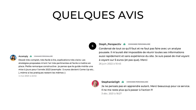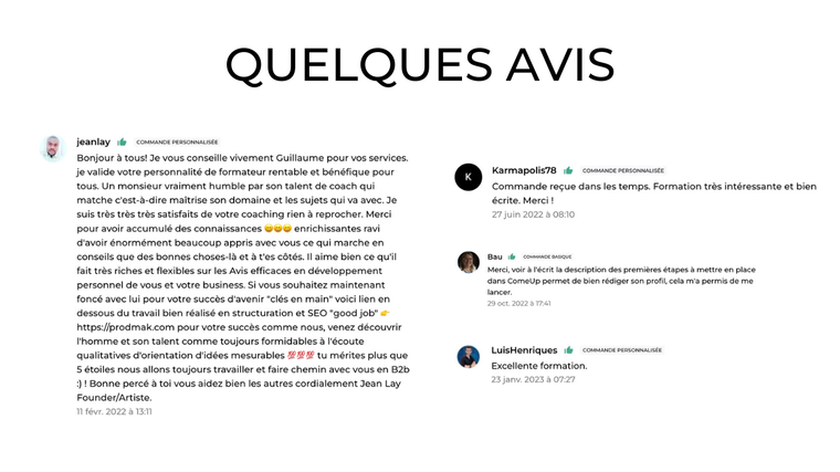 Avec cette formation, vous pourrez vous lancer sur ComeUp avec un plan d'action et des techniques acquises durant plusieurs années.