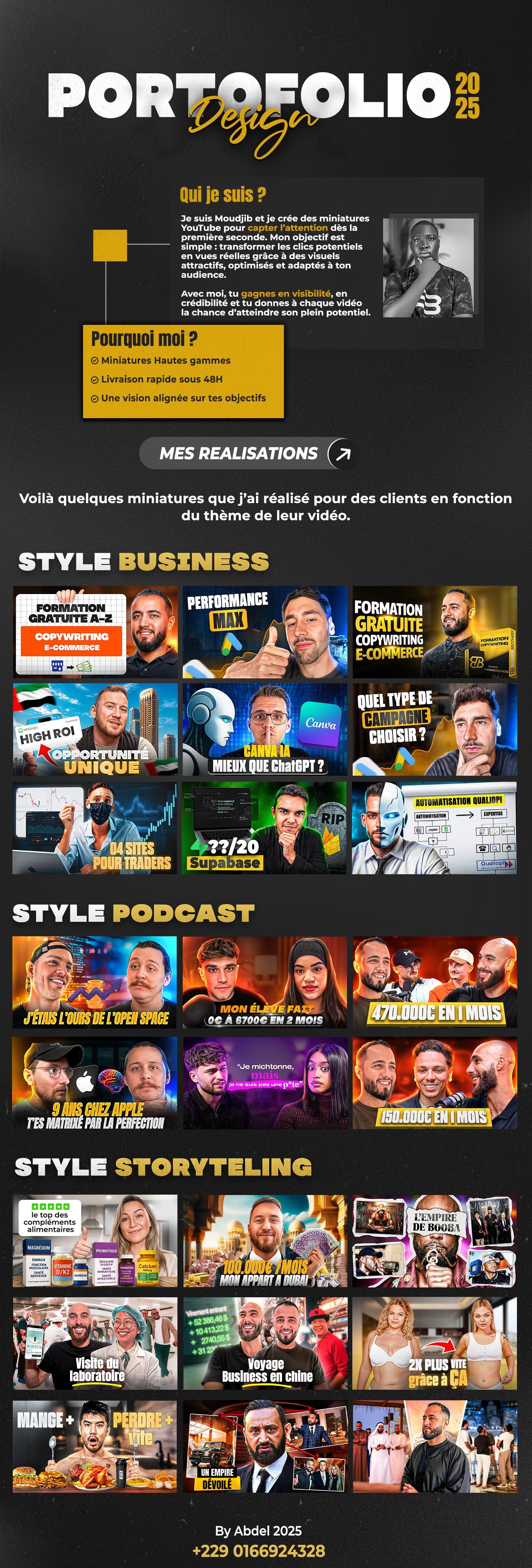 Je suis un designer passionné qui crée des visuels forts, cohérents et irrésistibles : miniatures YouTube, visuels ComeUp, bannières et contenus pour les réseaux.