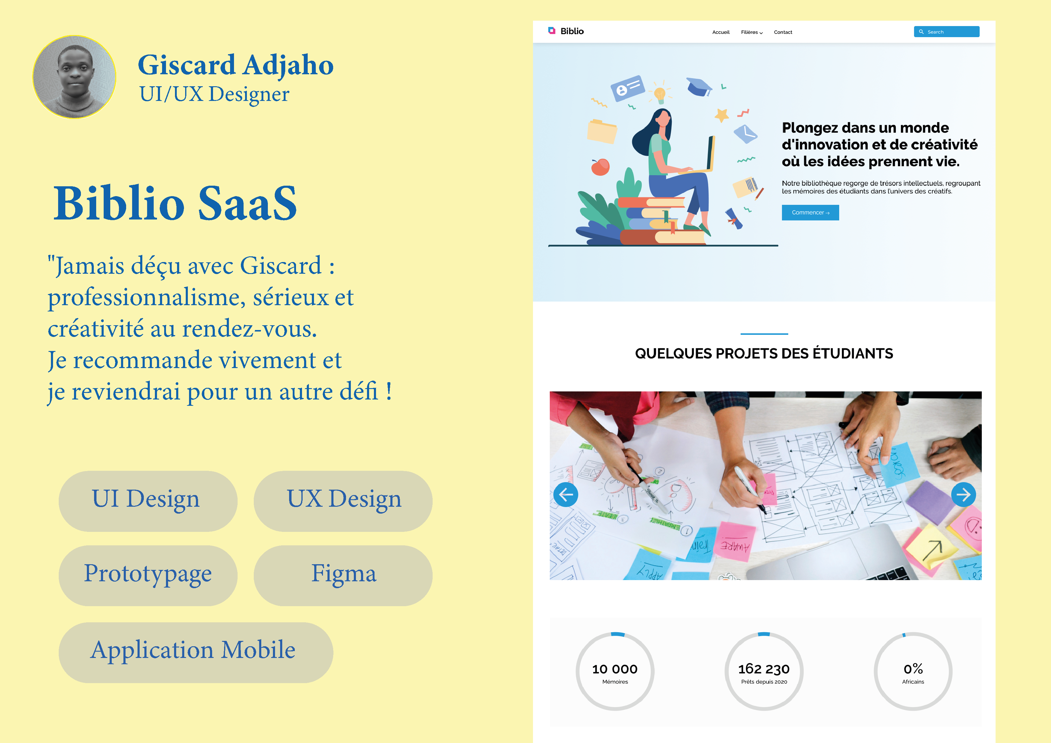 Je suis Giscard, UI/UX Designer passionné, avec une expertise pointue dans la création d’interfaces ergonomiques, intuitives et esthétiques.