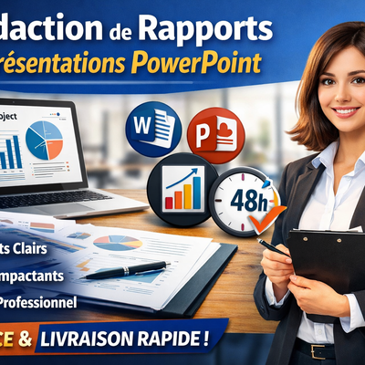 Je vous propose un service professionnel de rédaction de rapports et de création de présentations PowerPoint claires, structurées et adaptées à vos besoins (études, projets, qualité, production, business, etc.).