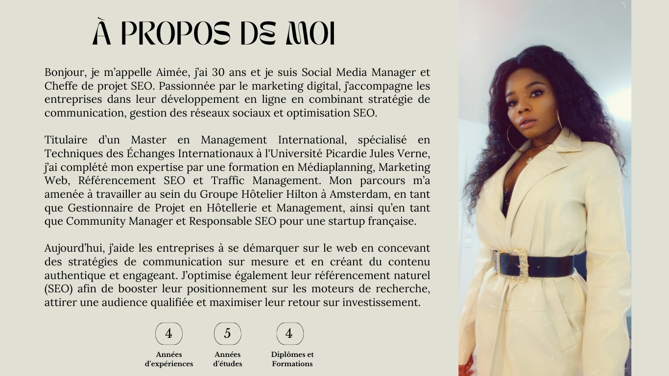 Bonjour, je m’appelle Aimée, je suis Social Media & Community Manager et Cheffe de projet SEO. Passionnée par le marketing digital, j’accompagne les entreprises dans leur développement en ligne en combinant stratégie de communication, gestion des réseaux sociaux et optimisation SEO.