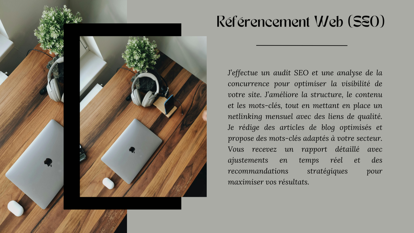 J’accompagne les entreprises dans le développement de leur présence en ligne grâce à des stratégies de communication digitale sur mesure et un référencement optimisé.