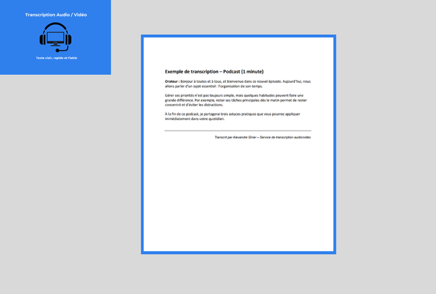 Bonjour 👋 Je m’appelle Alexandre et je propose des services de transcription audio et vidéo en français. Mon objectif est simple : vous livrer un texte clair, sans fautes et dans les délais. Sérieux, organisé et réactif, je m’engage à fournir un travail de qualité professionnelle, même pour les fichiers les plus urgents.