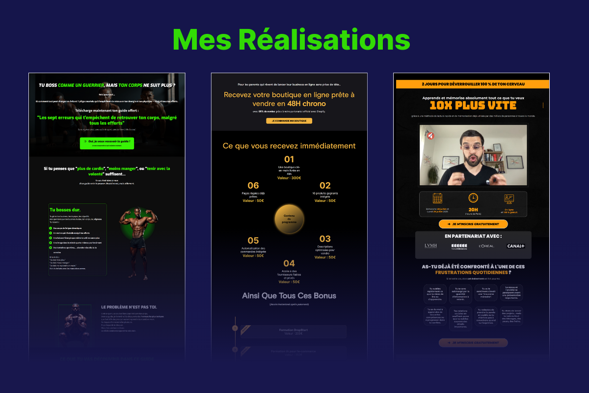 Issu du graphisme et du brand design, j’ai accompagné de nombreux indépendants dans la création de leur identité visuelle et la mise en place de systèmes digitaux performants. Aujourd’hui, je combine mes compétences en stratégie, funnel building, UI/UX, acquisition clients et IA créative pour offrir un accompagnement complet.