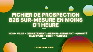 FICHIERS B2B PRÊTS À L'EMPLOI Fichiers de prospection Premium par secteur Dirigeant nominatif et numéro de téléphone vérifiés Format Excel prêt à l'import CRM Livraison rapide (2 à 3 jours)