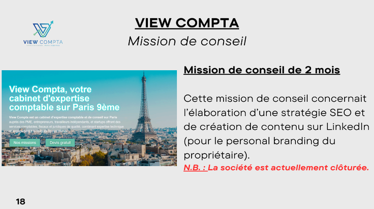 Mission de conseil en contenu sur les réseaux sociaux (LinkedIn et Instagram), SEO et publicité en ligne (Google Ads). -