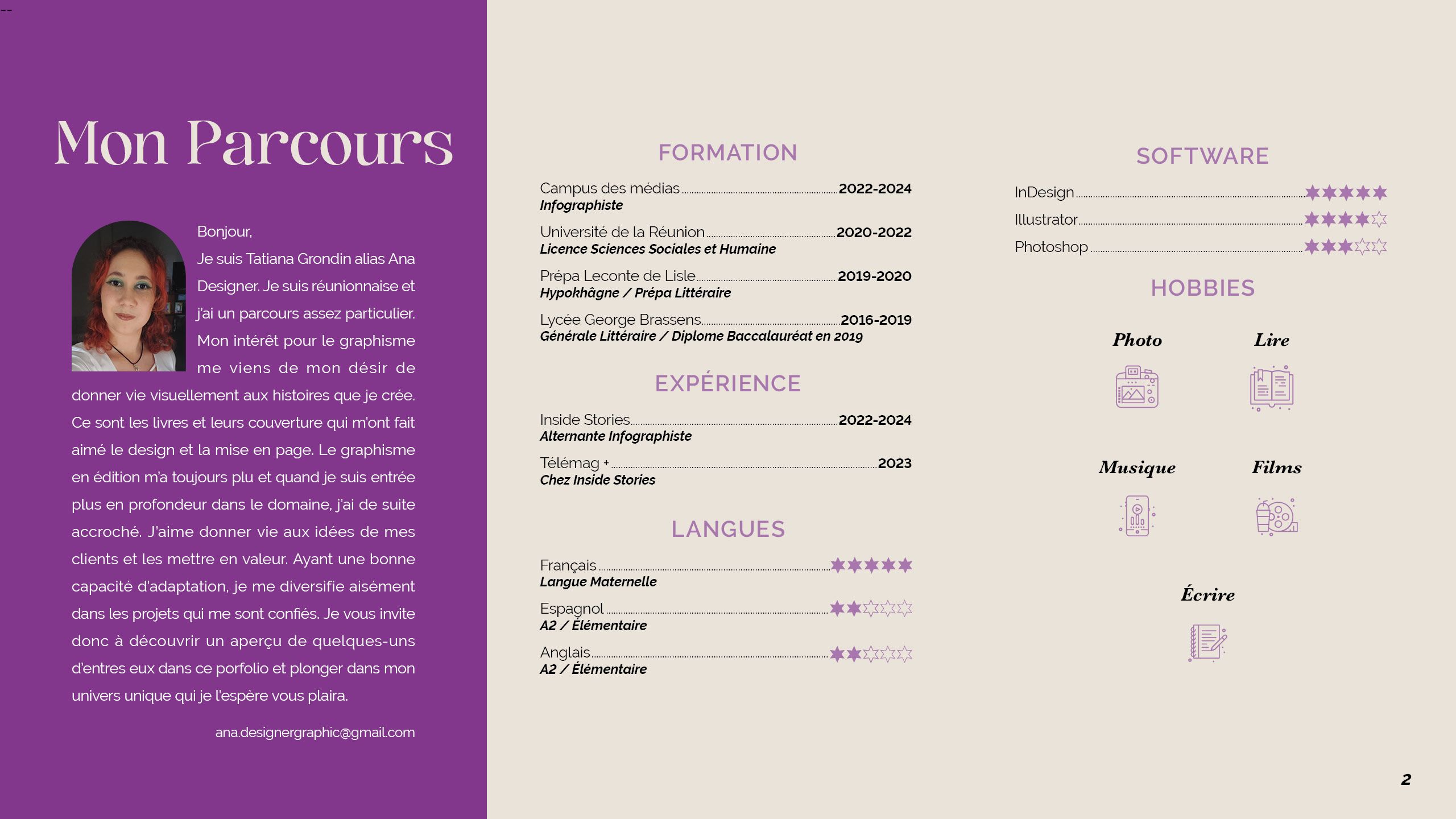 J’interviens de la création de la maquette à la préparation pour impression en passant par les déclinaisons digitales. J’utilise la suite Adobe (InDesign, Illustrator, Photoshop) et j’aime travailler à l’écoute de mes clients en les impliquant dans le processus créatif tout en apportant mon regard professionnel.