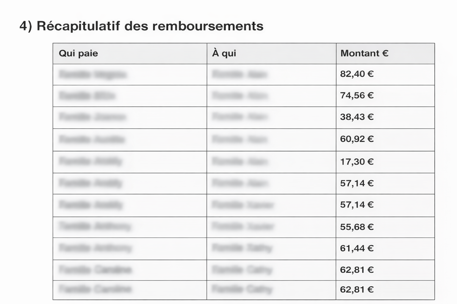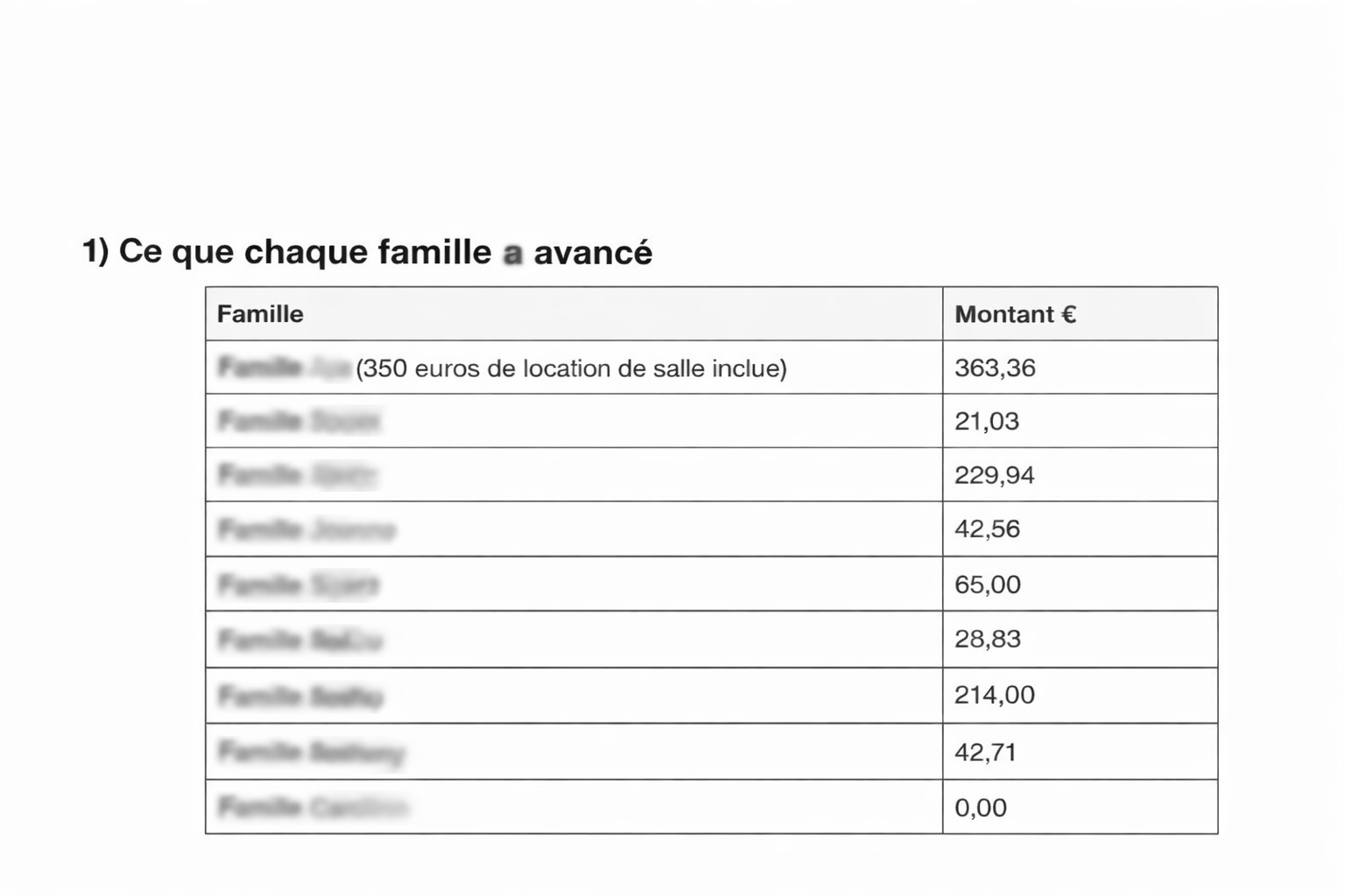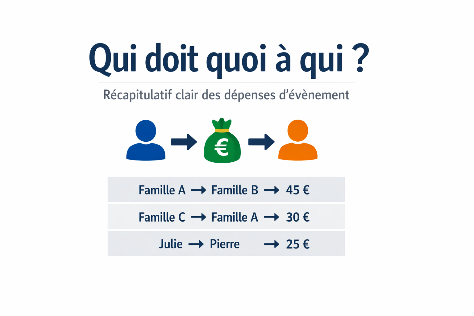 Je vais faire un récapitulatif clair de vos dépenses d'événement (qui doit quoi à qui)