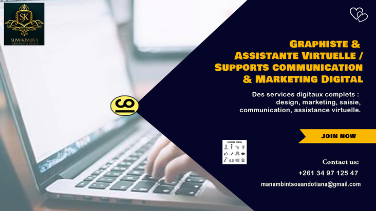 Graphiste et Assistante Virtuelle, je propose des services pour accompagner vos projets digitaux et administratifs. Mes prestations incluent : design graphique, supports de communication, marketing digital, saisie de données, traduction FR/EN et transcription audio/vidéo. Je m’engage à fournir un travail précis, créatif et fiable pour répondre aux besoins de votre entreprise ou projet.