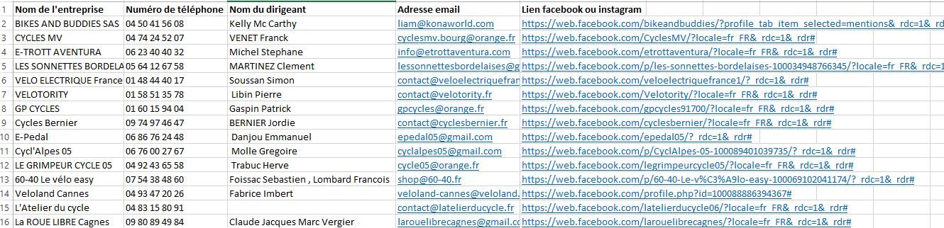 Constitution d’une base de données de vendeurs de vélos en France pour une campagne de prospection. Recherche et vérification de plus de 50 entreprises : nom, dirigeant, téléphone, email, réseaux sociaux. -