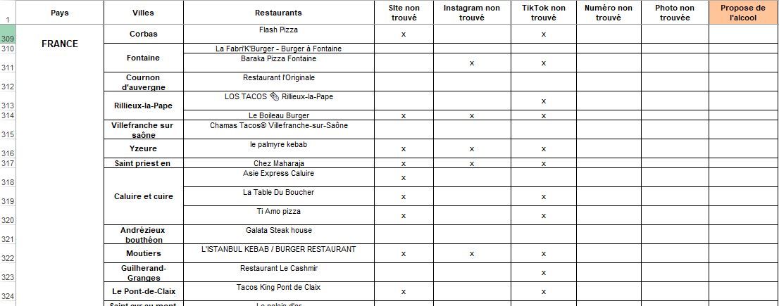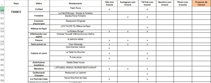 J'ai réalisé une recherche de restaurants Halal, ce qui m'a permis de constituer une base de données structurée regroupant des établissements répartis dans plusieurs villes de France, d’Espagne, etc... -