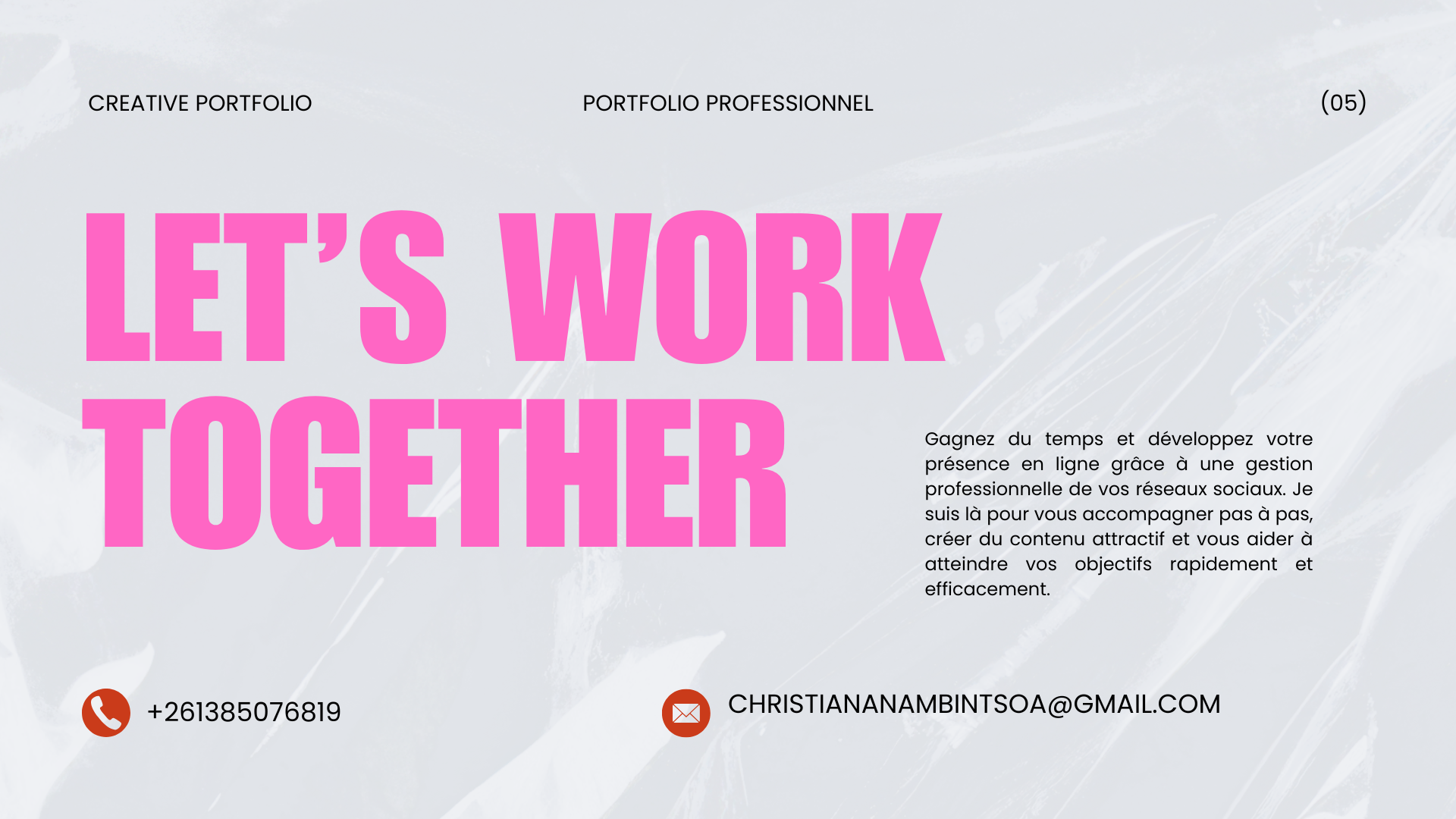 Je propose mon aide pour : répondre aux messages, gérer vos réseaux sociaux, faire de la saisie de données, organiser vos tâches et soutenir votre activité en ligne.