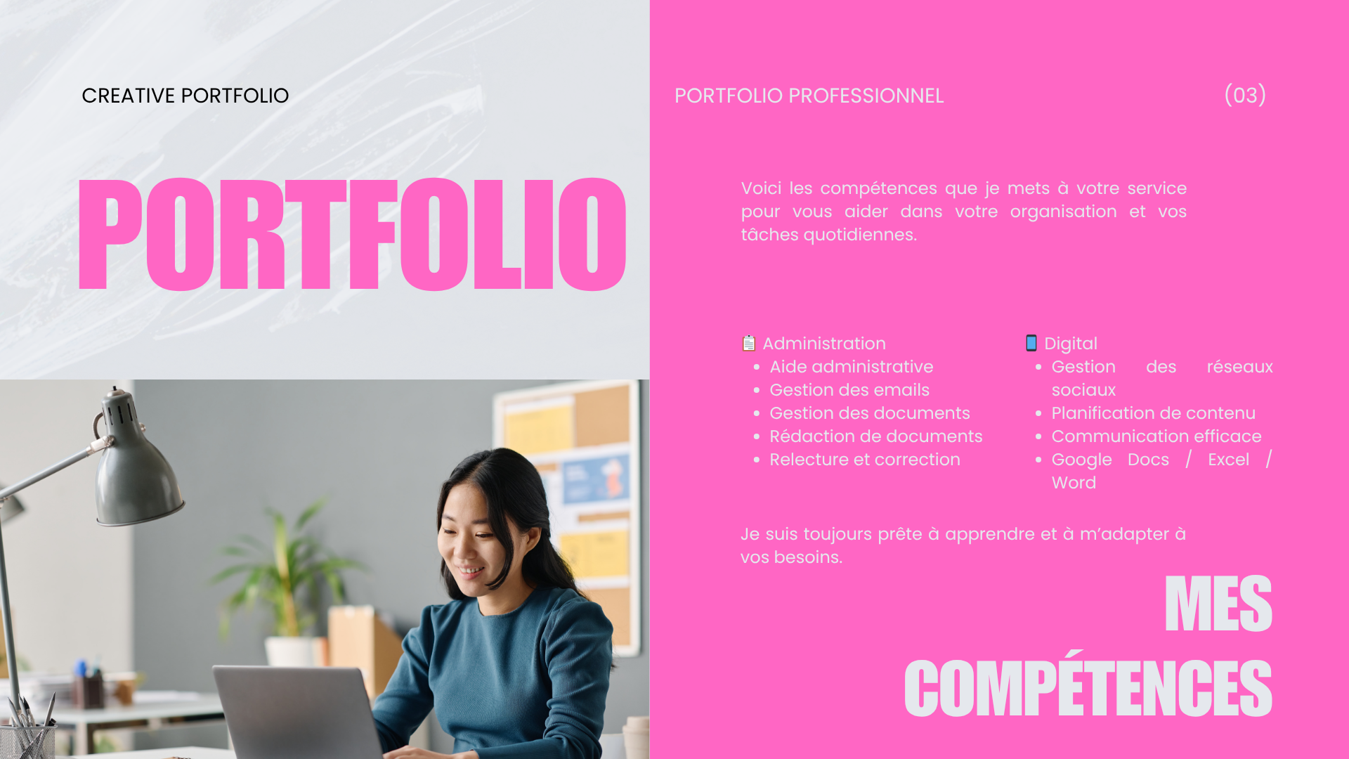 Même si je suis débutante, je suis sérieuse, ponctuelle et déterminée à fournir un travail de qualité. Je suis disponible pour apprendre et m’adapter à vos besoins spécifiques.